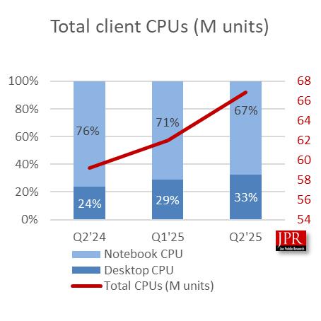 IT之家注意到,数据显示客户端 CPU 出货量由第一季度的约 6200 万颗增至第二季度的 6700 多万颗,其中桌面处理器占比约 33%,移动处理器约 67%。